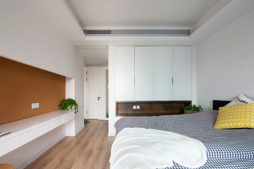 卧室也是简约现代风,整体也是灰木白色为主,电视墙位置设计成书桌,中间部分是8毫米厚度的软木板,上面可以记录生活的点点滴滴。